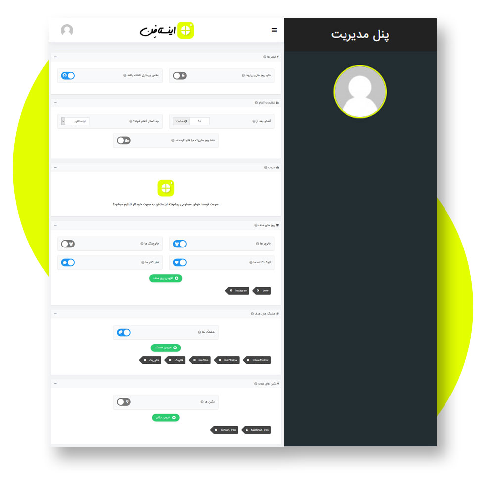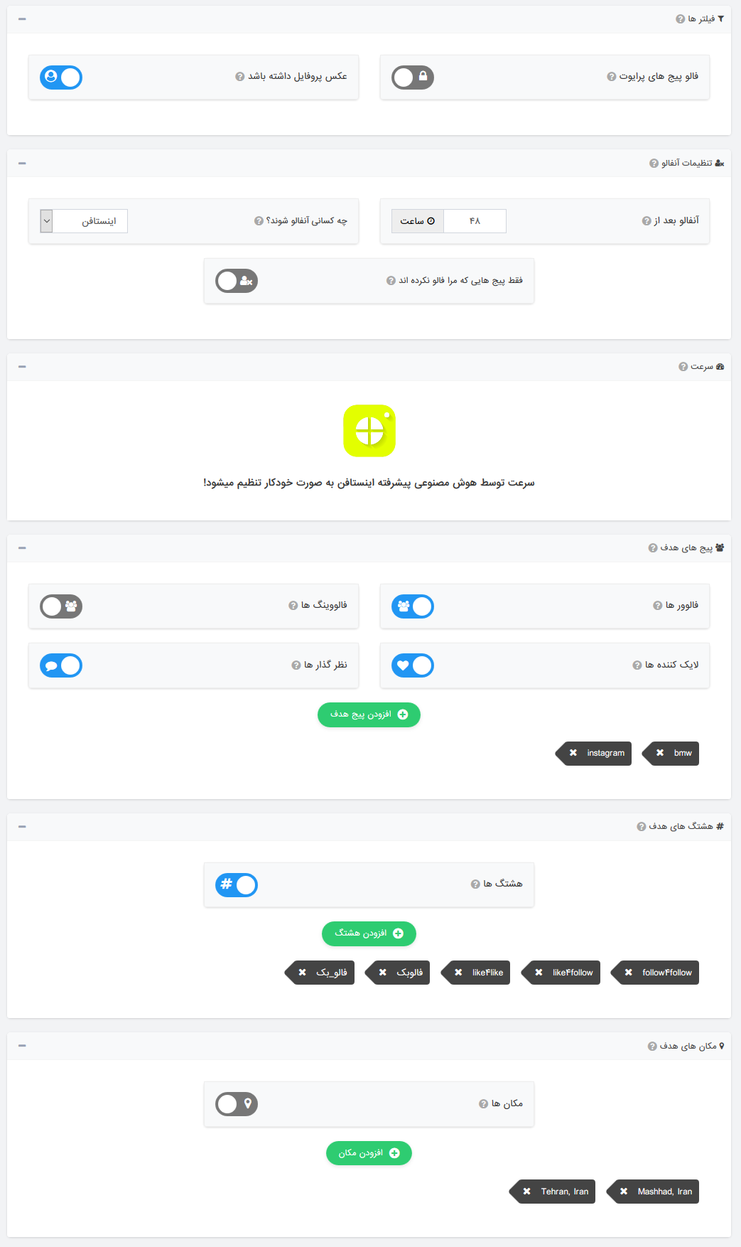 اینستافن فیلتر های متعددی را در اختیارتان قرار میدهد تا بتوانید اهداف خود را به صورت دقیق پیدا کنید و فعالیت مورد نظرتان نظیر فالو، آنفالو، لایک، ارسال نظر و یا ارسال پیام دایرکت را روی پیج ها انجام دهید.